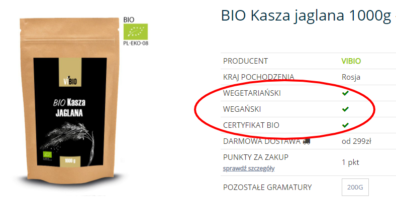Czasem wystarczy naprawdę niewiele: nawet mała ikonka typu Bez glutenu, Wegańskie czy BIO przy odpowiednich produktach albo prosty system „zafajkowania”, który pozwala szybko filtrować ofertę. Takie detale robią ogromną różnicę w odbiorze sklepu. Tutaj przykład w jednym ze sklepów: