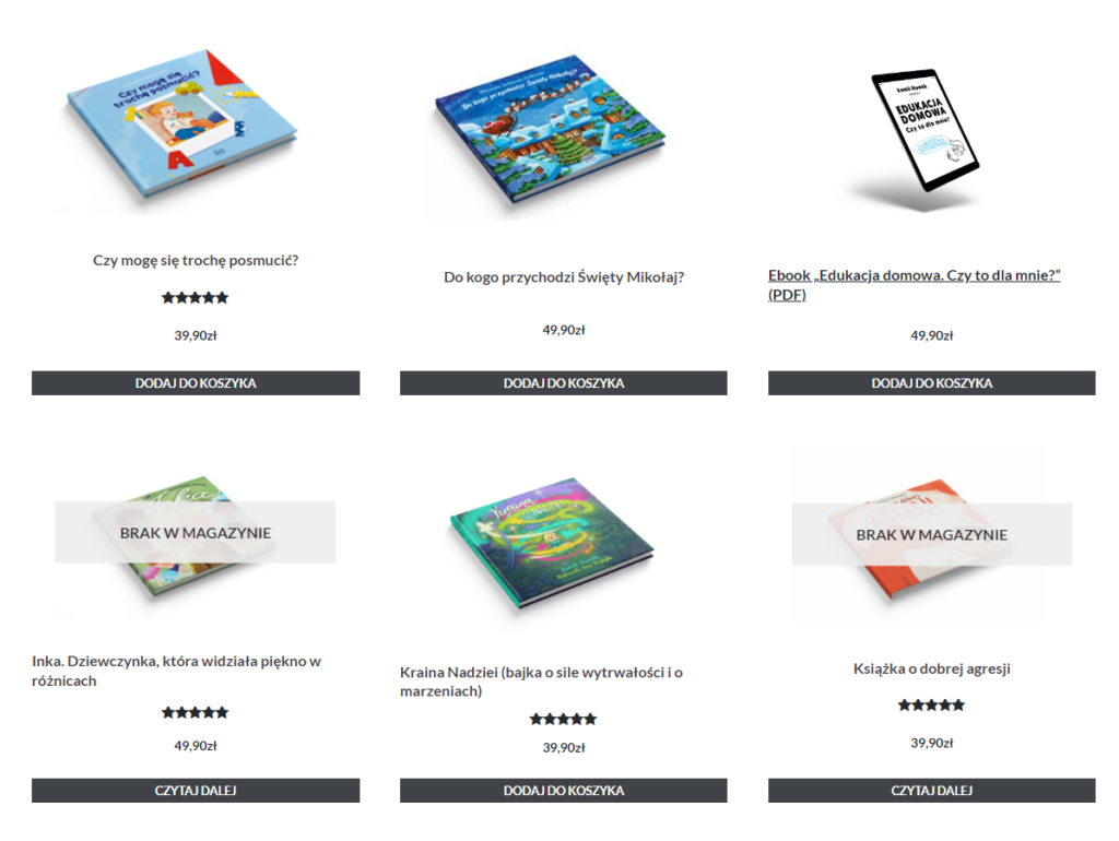 Do zmiany grafiki wybraliśmy dla Kamila gotową templatkę z ThemeForest, w której dostosowaliśmy kolory do identyfikacji wizualnej Blog Ojciec, wgraliśmy wszystkie treści oraz poukładaliśmy produkty w różne sekcje, oddzielając Bestsellery od Promocji, dodaliśmy również Opinie klientów.